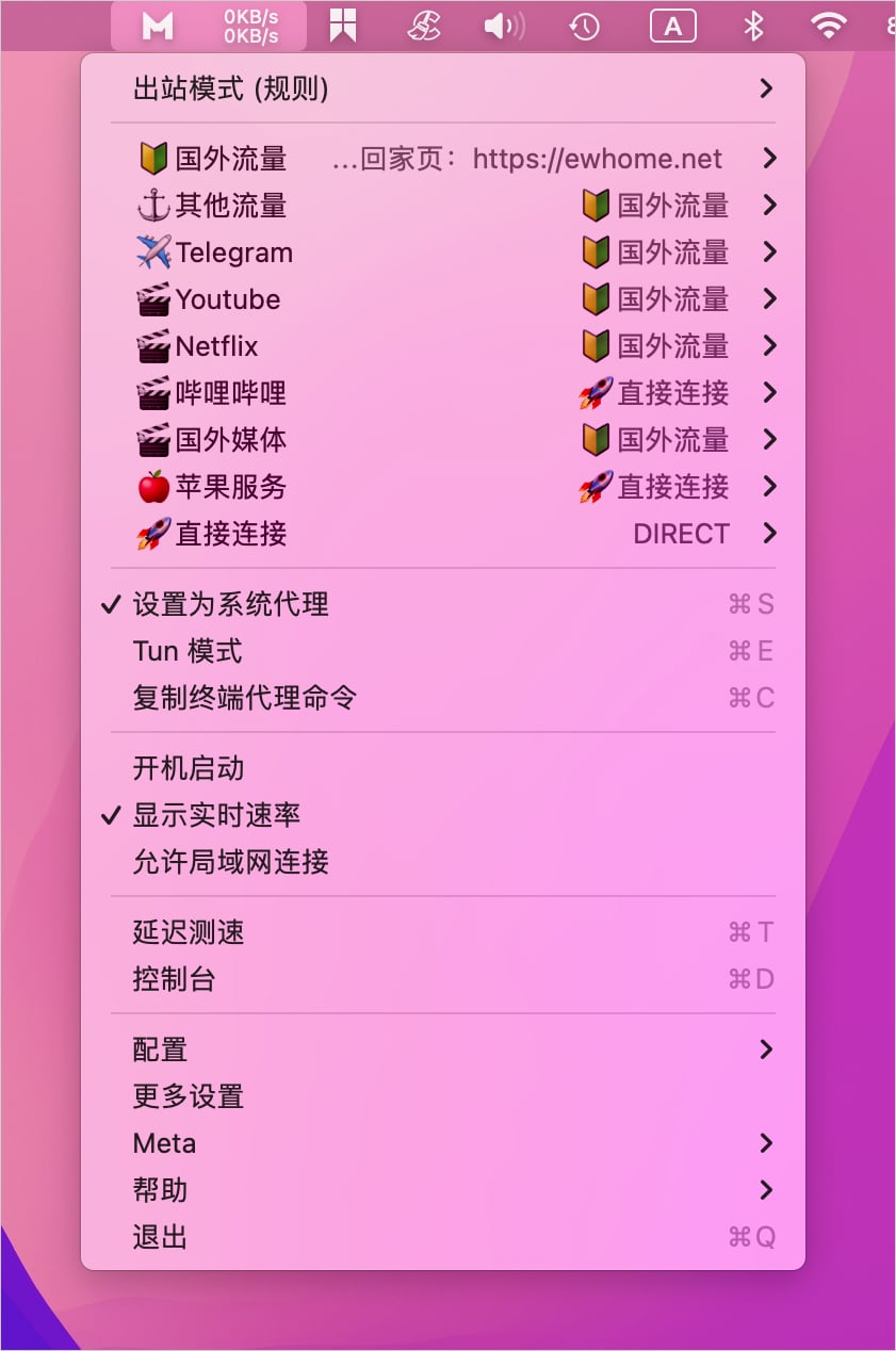 点击状态栏中的小猫咪软件图标,打开【主菜单】可以看到出站模式下有国外流量等选项,选择任意节点即可选择系统代理,如下图所示。